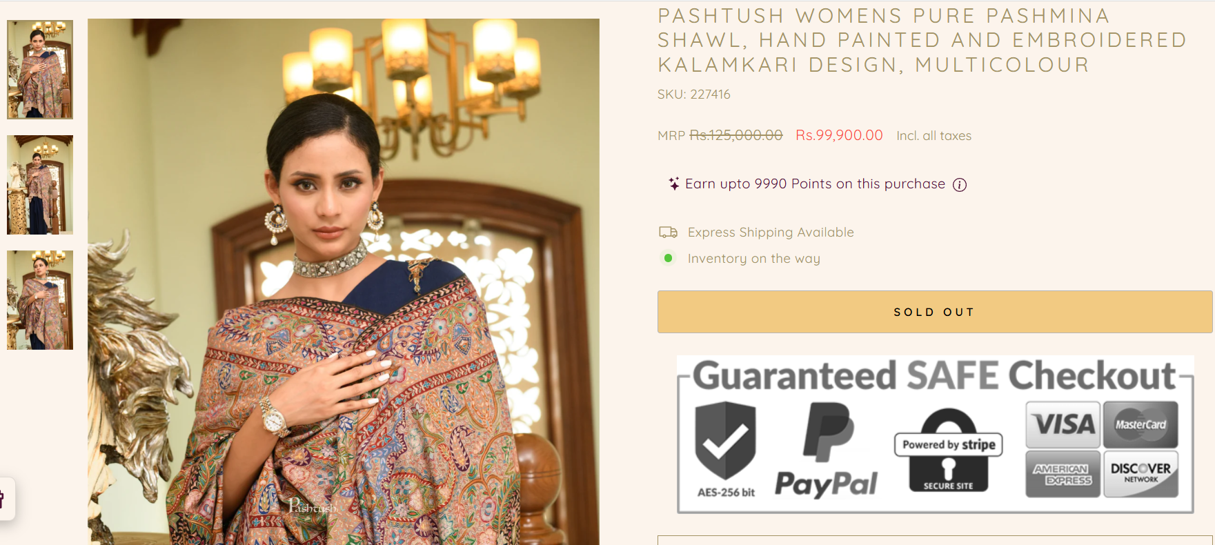 | 전체 자수 숄 ('Jaal') | 숄 전체에 촘촘하게 손자수가 들어간 작품. 자수의 밀도에 따라 가격 급상승. | ₹ 100,000 ~ ₹ 500,000 때로는 그 이상 (160만원~750만원 이상) |